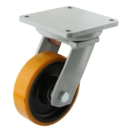 Transportwiel (zwenk) met plaatbevestiging met stalen gaffel, wiel met gietijzeren velg, PU band ±94 shore A